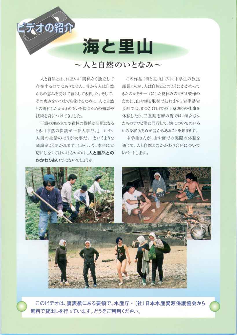 中学生の放送部員3人が、人は自然とどのようにかかわってきたのかをテーマにした夏休みのビデオ製作のために、山や海を訪れます。岩手県岩泉町では、まつたけ山での下草刈りの仕事を体験したり、三重県志摩の海では、海女さんたちのアワビ漁に同行して、漁についてのいろいろな取り決めが昔からあることを知ります。中学生3人が、山や海での実際の体験を通じて、人と自然のかかわり合いについてレポートします。