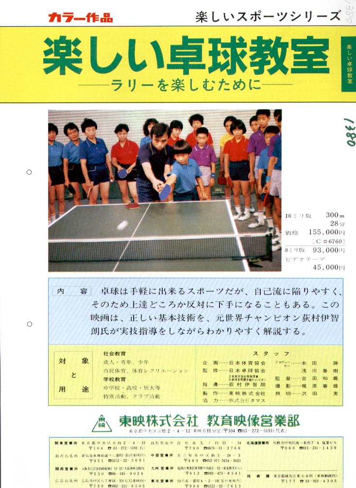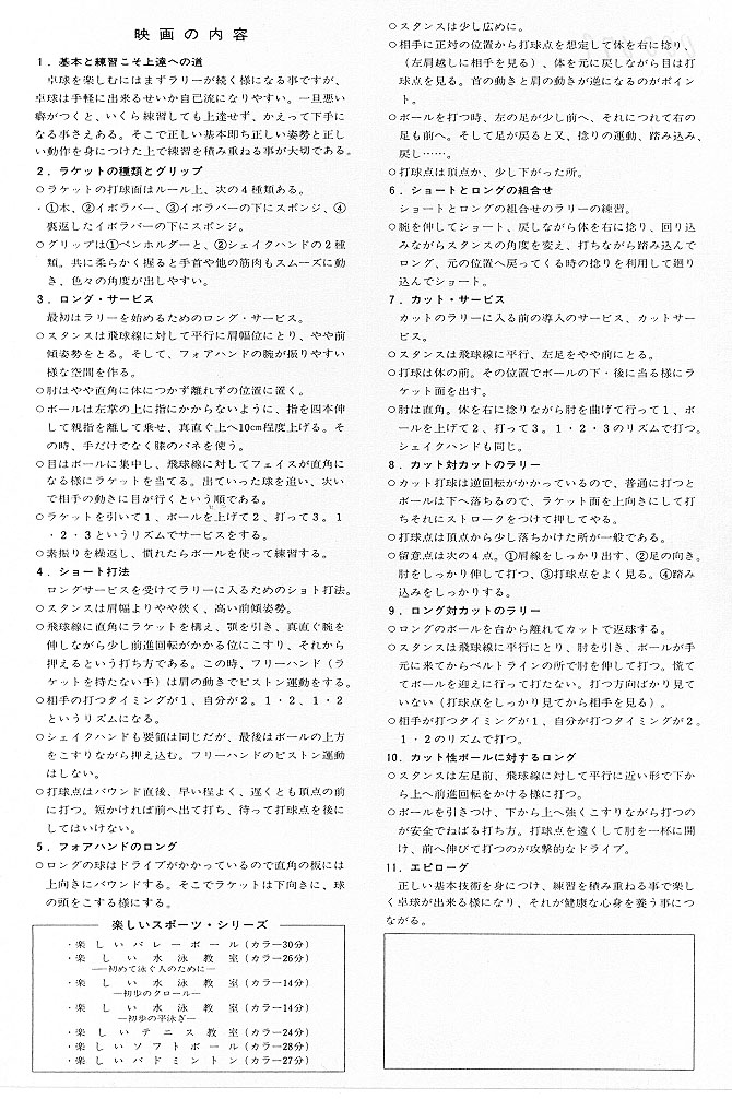 ラケットの種類とグリップ、ショート打法、フォアハンドのロング、ショートとロングの組み合わせなど卓球の基礎的技術を萩村氏の実技指導により説明している。