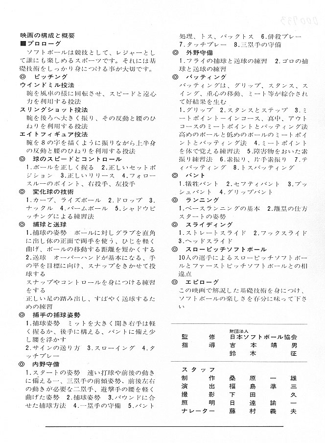 ピッチング、捕球と送球、内外野の守備、バッティングなどソフトボールの基礎的技術について、女子ソフトボールチームの実技により説明している。